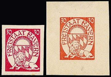 10 Pfg. Bayern, Motiv "Stahlhelm im Lorbeerkranz", vier verschiedene Einzelabzüge im Großformat, Johann Wurstl 1919, auf gummiertem Papier, sign. Ludin