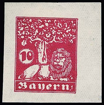 10 Pfg. "Baum und Löwe", vier verschiedene Essays von Johann Wurstl 1919 in rotbraun, rot, violettblau und grau auf gummiertem Papier im Großformat, sign. Ludin