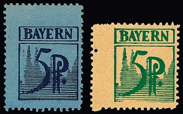 5 Pfg. "Bavariae und Stahlhelm", fünf Essays von Johann Wurstl 1919 im kleinen Format in hellblau, olivgelb,orange, rotorange und blau auf meist gummiertem Papier, sign. Ludin