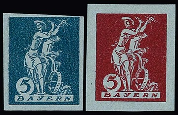 5 Mk. Bayern-Abschied, Motiv der 20 Pfg., zwei geschnittene Probedrucke, blau und rot, je auf bläulichem Papier