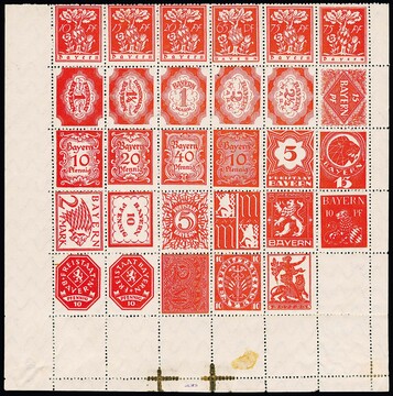 "Bayern-Abschied", 5 Pfg. bis 2 Mk., kpl. Probedruck-Zusammendruck-Bogen (kleine Mängel) mit 29 verschiedenen Probedrucken, siehe Foto