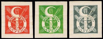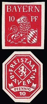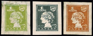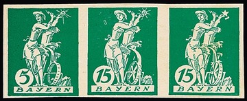 5 und 15 Pfg. Bayern-Abschied im zusammenhängenden Probedruck-Dreierstreifen auf Kartonpapier