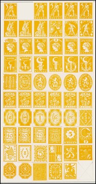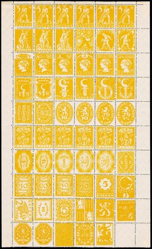 Bayern-Abschied, kpl. gezähnter Probedruck-Zusammendruckbogen (Rand Falzreste) mit 59 meist verschiedenen Werten, alle in gelbocker, so selten!