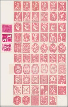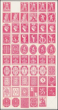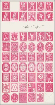 Bayern-Abschied, 62 meist verschiedene Probedrucke/Entwürfe, teils in Zusammendruck-Einheiten, alle in rosalila, auf weißem Kartonpapier (3) bzw. der Rest auf normalem Papier