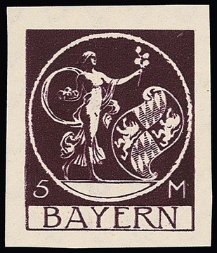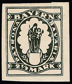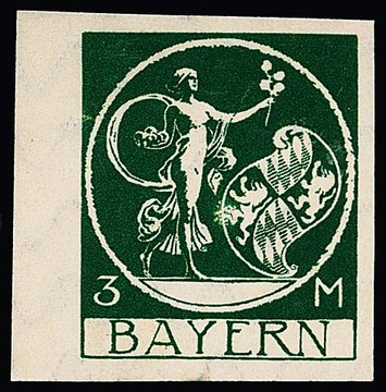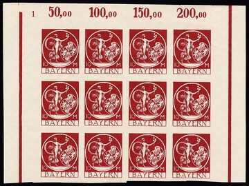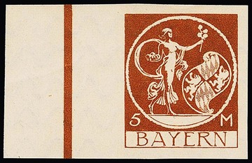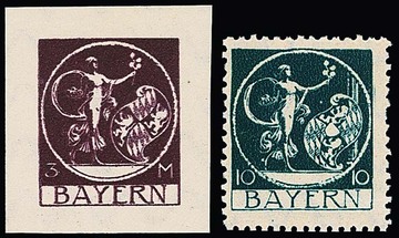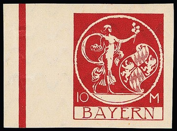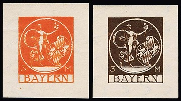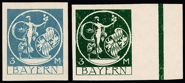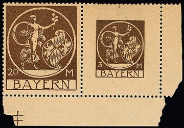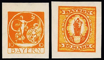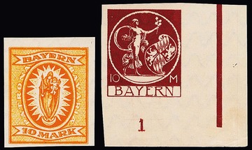 10 Mk. orange, geschnittener Probedruck in Zeichnung "Patrona Bavariae", sowie geschnittener Probedruck braunrot in endgültiger Zeichnung aus der rechten unteren Bogenecke