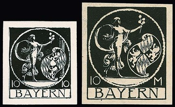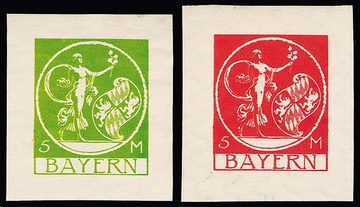 10 Mk. Bayern-Abschied, zwei verschiedene ungebrauchte Probedrucke, einmal in endgültiger Zeichnung, aber im kleinen Format