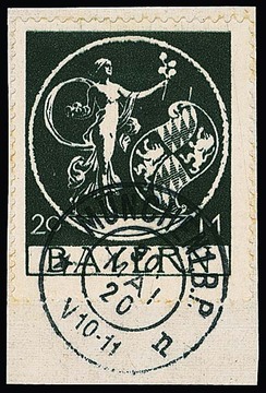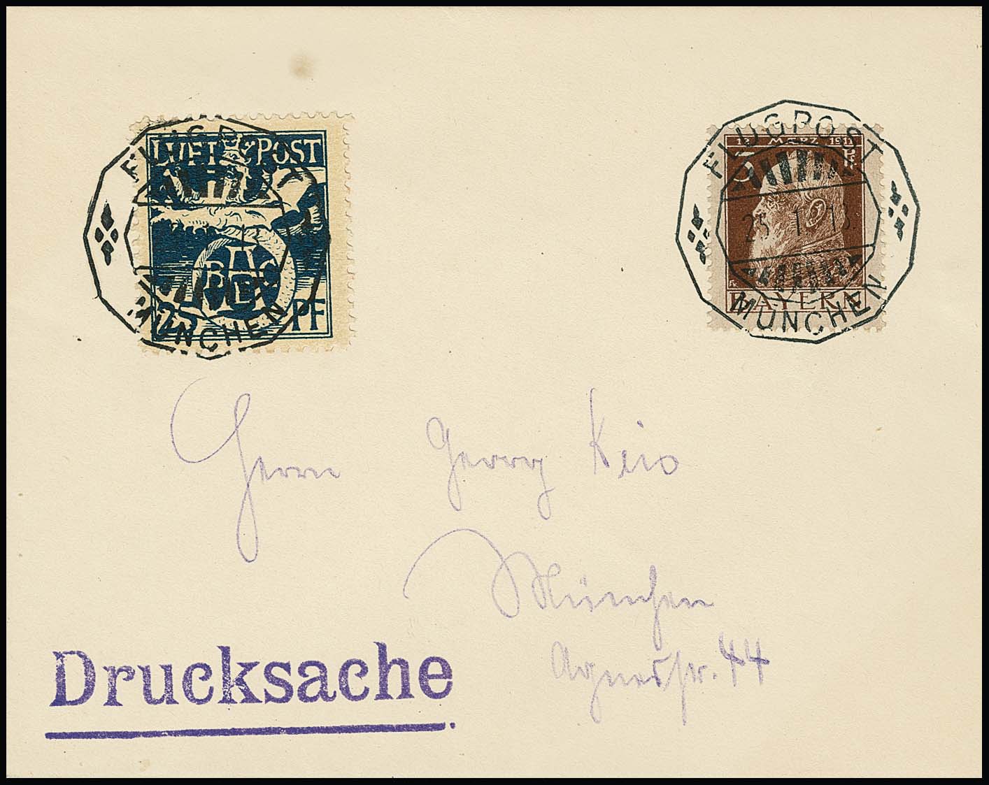 Halbamtliche Flugpostmarke zentrisch gestempelt auf Flugpost-Drucksachencouvert aus München, 25.1.1913. Mi. 500,-