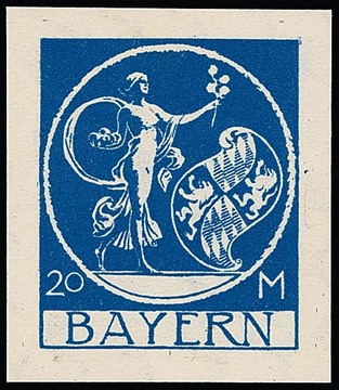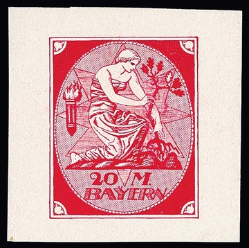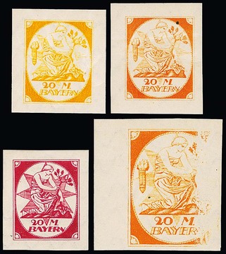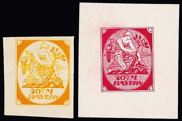 20 Mk. "Bavariae", 1919, rot, blau, braun, drei versch. Essay-Einzelabzüge von Julius Diez im Großformat, auf gummiertem Kreidepapier, geschnitten