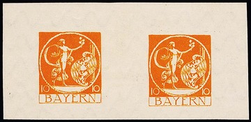 10 Mk. Bayern-Abschied, in schwarz, dunkelgrün und orange (Paar), gesamt vier geschnittene Probedrucke im kleineren Format
