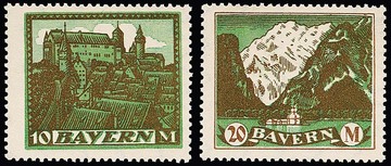 Bayerische Ansichten, 13 mehrfarbige Entwürfe zu einer geplanten Freimarken-Serie, zehn von Zietara, drei von v. Weech, alle gezähnt