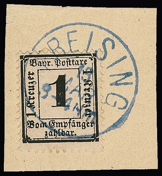 Portomarke 1 Kr. schwarz, Plattenfehler "BOM" (Feld 59), besonders schönes Luxusbriefstück mit idealem blauem K1 "Freising", Mi. lose 1400,- + (der ursprüngliche Briefteil liegt bei), sign. Pfenninger und Fotoexp. Stegmüller