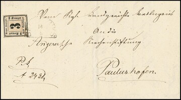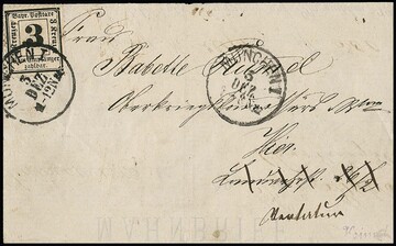 Portomarke 3 Kr. schwarz einzeln auf Kabinett-Retour-Ortsbrief aus München, hs. "ist gestorben", Attest Brettl. Mi. 1200,-