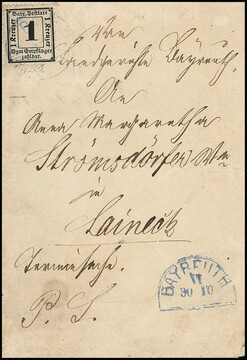 Portomarke 1 Kr. schwarz einzeln auf Prachtbrief mit K1 "Bayreuth" im Nahbereich nach Laineck. Sign. Pfenninger und Attest Brettl "in tadelloser Gebrauchserhaltung". Mi. 2000,-