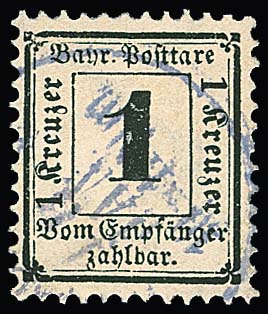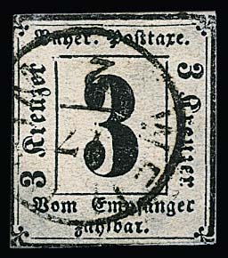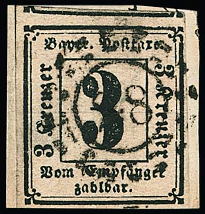 Portomarke 3 Kr. schwarz, berührtes Exemplar mit sehr seltener Entwertung durch Fingerhut-K1 "Weilheim", "es sind nur wenige Stücke dieser Marke mit Entwertung durch Fingerhutstempel bekannt", gemäß neuem Attest Sem (Hb. 2000,-)