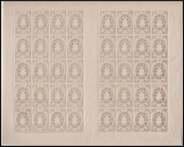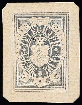 Telegraphenmarke 23 Fl. 20 Kr./50 Fr. lilagrau, seltener Essay-Einzelabzug im kombinierten Buch- und Prägedruck