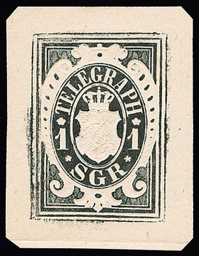 Telegraphenmarke 1 Sgr. schwarz, seltener Essay-Einzelabzug im kombinierten Buch- und Prägedruck