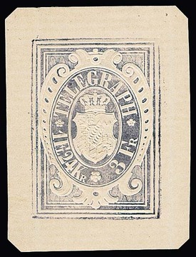 Telegraphenmarke 1 Fl. 24 Kr./3 Fr. graulila, seltener Essay-Einzelabzug im kombinierten Buch- und Prägedruck