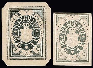 Telegraphenmarken 1 Kr./1 Fr. grau, bzw. dunkelgrau, zwei seltene verschiedene Essay-Einzelabzüge im kombinierten Buch- und Prägedruck (einmal kl. Randriß)