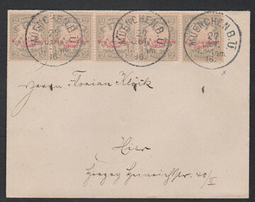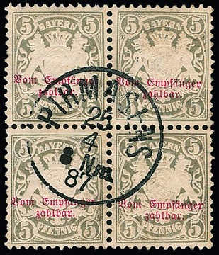 Portomarke 5 Pfg. grau, Wz. 3, seltener Viererblock mit zentrischem K1 "Pirmasens" 1887, zwei kurze Zähnchen, Mi. 500,-