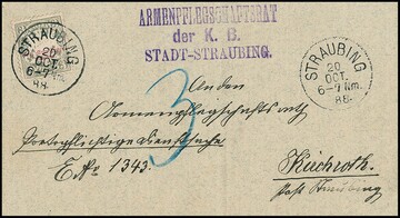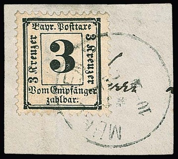 Portomarke 3 Pfg. als tadellose Einzelfrankatur auf schön gestempeltem Brief von Straubing in den eigenen Landbezirk nach Kirchroth, beim Brief fehlt rs. ein Klappenteil, sign. Brettl. Mi. 500,-