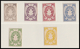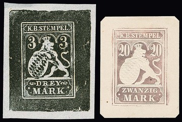 Gebührenmarken, zwei Probe-Einzelabzüge 3 Mk. rot und schwarz auf sehr dünnem, sog. "Japan"-Papier, sowie elf Probe-Einzelabzüge von 5 Pfg. bis 20 Mk. in grauviolett, kombinierter Buch-/Prägedruck