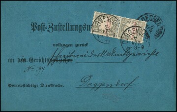 Portomarke 10 Pfg., gute A-Zähnung, im seltenen Paar auf blauer Postzustellurkunde aus Deggendorf, Mi. ohne Bewertung, sign. Helbig