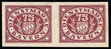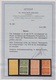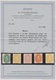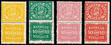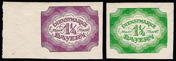 2 1/2 Mk. und 10 Pfg., rosalila, grün, gelbocker und orangerot, vier Essay-Zusammendruckpaare von Siegmund von Weech zur Abschiedsausgabe, auf Wasserzeichen- bzw. Kartonpapier, selten, wie auch das Attest Helbig bestätigt