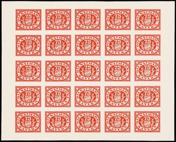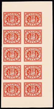 75 Pfg. purpur, olivgrün, rotorange und dunkelbraun, je geschnittene Probedrucke auf dickem Papier in Rand-Zehnerblöcken
