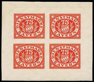 75 Pfg., fünf geschnittene Probedruck-Viererblöcke: dunkelolivgrün auf Kreidekarton, rot auf dickem Papier, Einzelabzüge olivgrün und rotorange auf gummiertem Papier (teils postfrisch, einmal randhell) und purpur