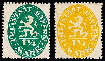 1 1/4 Mk. rotorange, grün, ocker, rosalila und gelbocker, fünf Entwürfe "Heraldischer Löwe" von Siegmund von Weech 1919, gezähnt, auf Wasserzeichen- bzw. Kartonpapier, zur Abschiedsausgabe, Attest Helbig