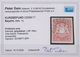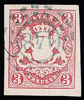 "148", seltener blauer oMR von Gangkofen sehr schön klar, nebst kleinem Tintenstrich, auf breitrandigem Kabinettstück Wappen 3 Kr., Fotoexp. Sem