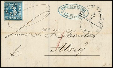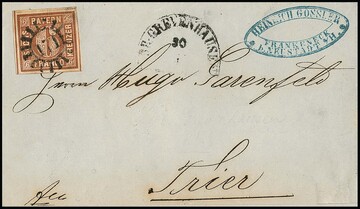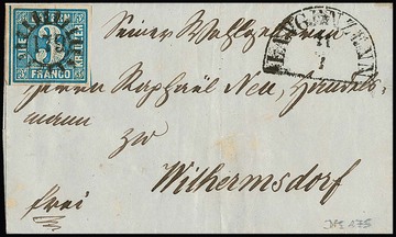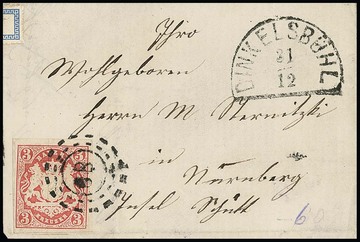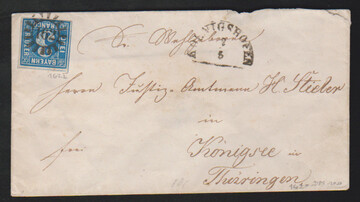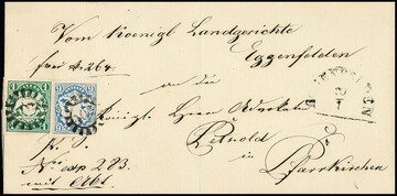 "62", gMR und typisch für diesen Ort auf die Marke übergehenden HK "Ebern" auf Brief (dieser unten kl. Randmgl.) mit kleiner Kabinett-Bogenecke 3 Kr. blau, ferner auf rs. unkpl. Brief mit Oberrandstück 3 Kr. blau