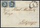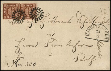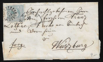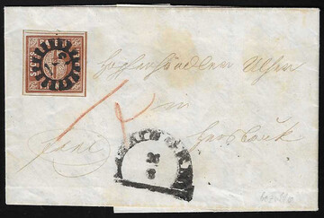 "81", zweifacher gMR, nebst Fingerhut-K1 "Esselbach", auf Faltbrief mit 3 Kr. (oben Randlinienschnitt), Feuser + 200,-