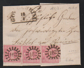 "162", gMR nebst HK "Göllheim" klar auf kleinem Briefchen mit Dreierstreifen 1 Kr. rosa, kl. Mgl.