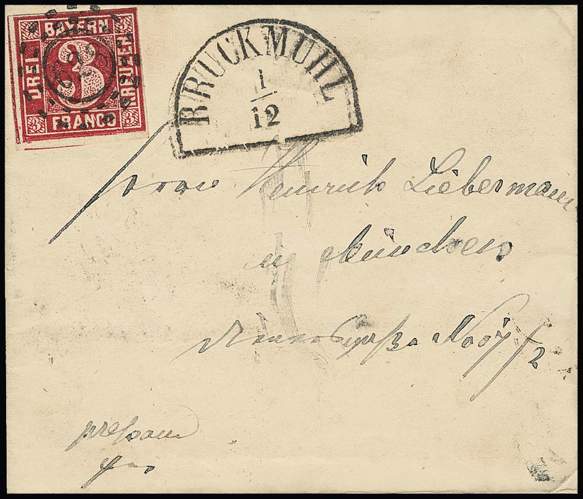 "628", oMR nebst HK "Bruckmühl" auf Brief 3 Kr. rot (etwas knapp), sowie auf Briefstück (gut)