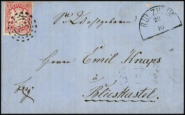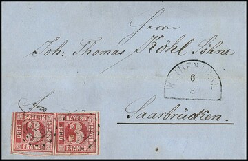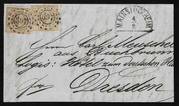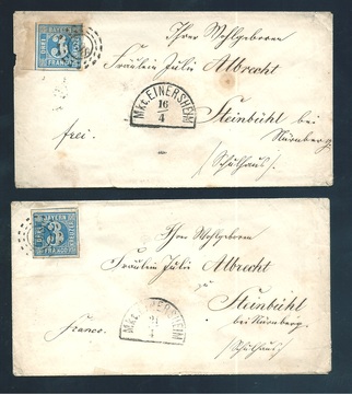 "698", oMR nebst HK "Mkt. Einersheim" auf zwei Couverts mit je 3 Kr. blau, Randstück, etwas fleckig, bzw. kleine rechte obere Bogenecke, aus einer Korrespondenz nach Steinbühl, sign. Stegmüller