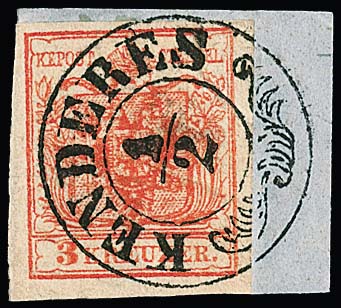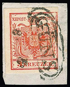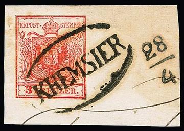 "Kremsier", seltener Ovalstempel (Mähren, Müller 1387a/150 P.) voll auf Briefstück mit 3 Kr. rosa im sog. "Zwergenschnitt", Datums-L2 nebengesetzt