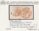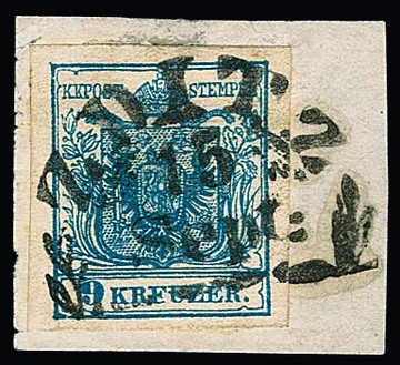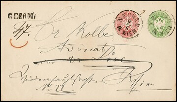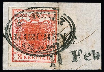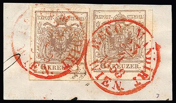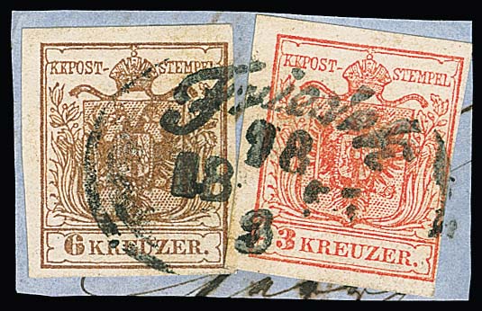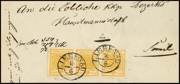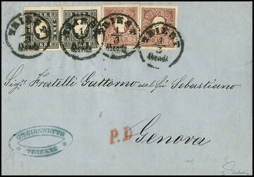 3 Kr. schwarz, Type Ib, im Paar, nebst 10 Kr. rotbraun, je Kabinettstücke auf Briefvorderseite mit K1 "Triest" nach Genua. Atteste Goller und Ferchenbauer. Mi. lose gest. über 900,-