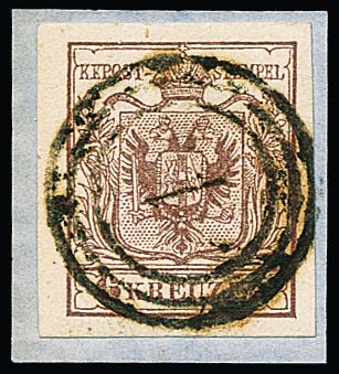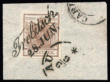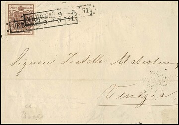 6 Kr. braun, Handpapier, Kabinettstück in seltener LV-Verwendung auf Faltbrief 1851 mit Ra1 von Verona, Mi. 550,-