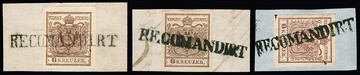 6 Kr. braun, Handpapier, drei Kabinett-/Luxusbriefstücke je mit alleiniger Entwertung durch vollen L1 "RECOMANDIRT" in sämtlich untersch. Typen