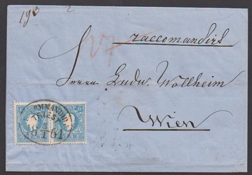 15 Kr. blau, Kabinettpaar vs., rs. Recoporto 10 Kr. braun durch Öffnen zerrissen, auf Einschreibebrief mit Ovalstempel "Recommandirt Triest" 1861 nach Wien