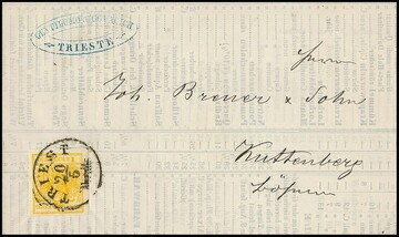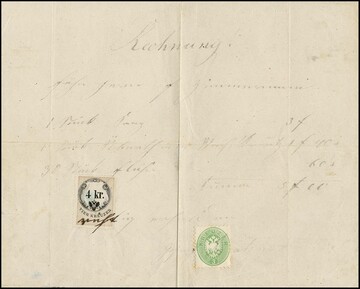 3 Kr. gelbgrün, Freimarke als Stempelmarke verwandt, in Mischfrankatur mit Stempelmarke 4 Kr. auf kompletter gef. Rechnung über 5 Gulden. Tintenschrift leicht verblaßt. Attest Ferchenbauer "seltene Mischabgeltung einer Fiskalgebühr durch Frei- und Stempelmarken"