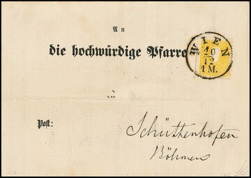 1 Kr. gelbocker, Handpapier, Type Ib, breitrandiger Kabinett-Dreierstreifen auf Brief (rs. nicht ganz kpl., zwei Klappenteile fehlen) mit K2 "Liebenau" nach Semil. Atteste Goller und Ferchenbauer. Mi. lose 1000,-