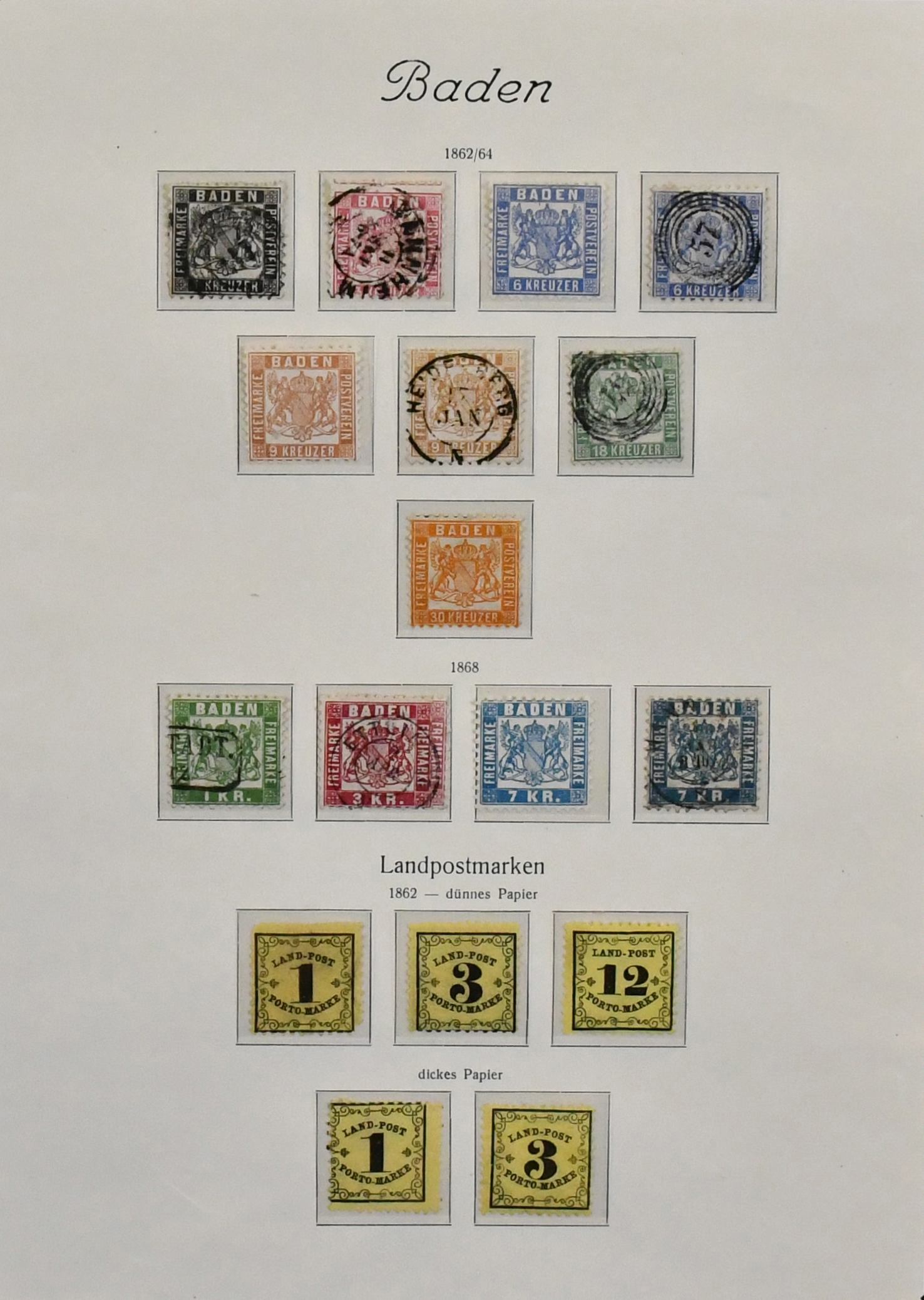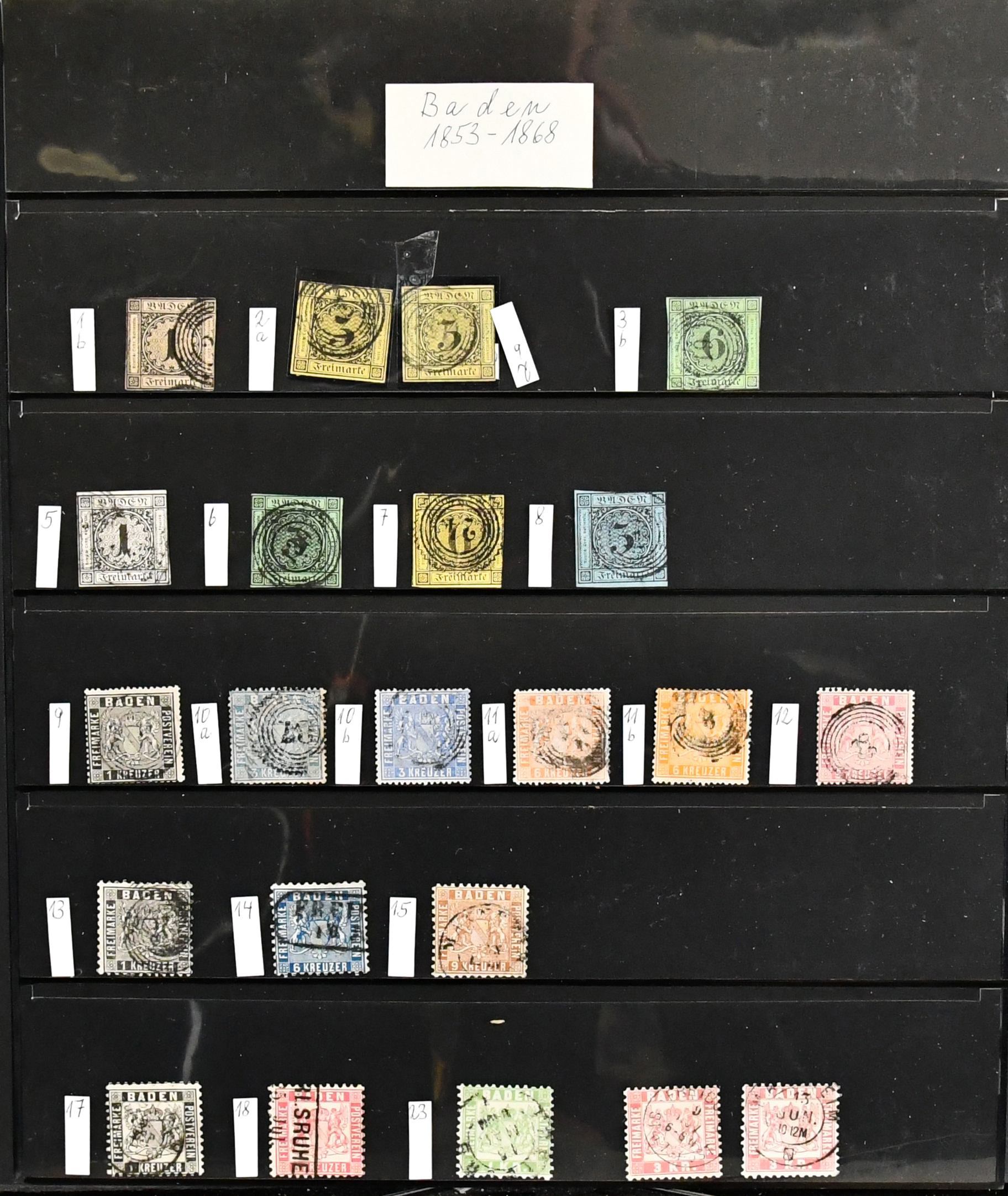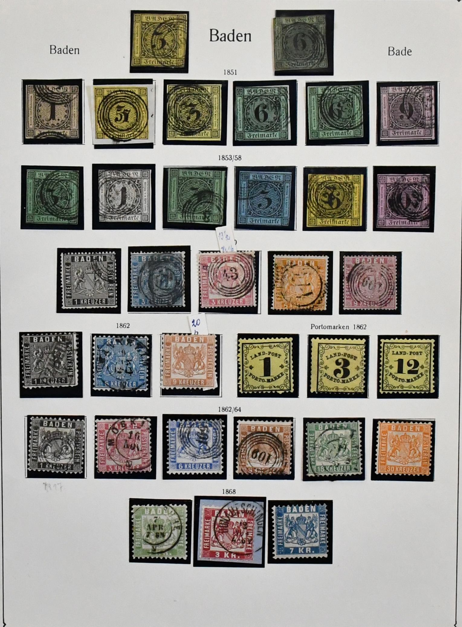 Baden, komplette Slg. auf KABE-Vordrucken in üblich untersch. Erhaltung, ab gest. Nr. 1a, mit Nr. 15a/b, immer fehlender Nr. 16, 18/30 Kr., Landpost kpl., sowie mit wenigen Belegen wie Nr. 3b, 4b etc.