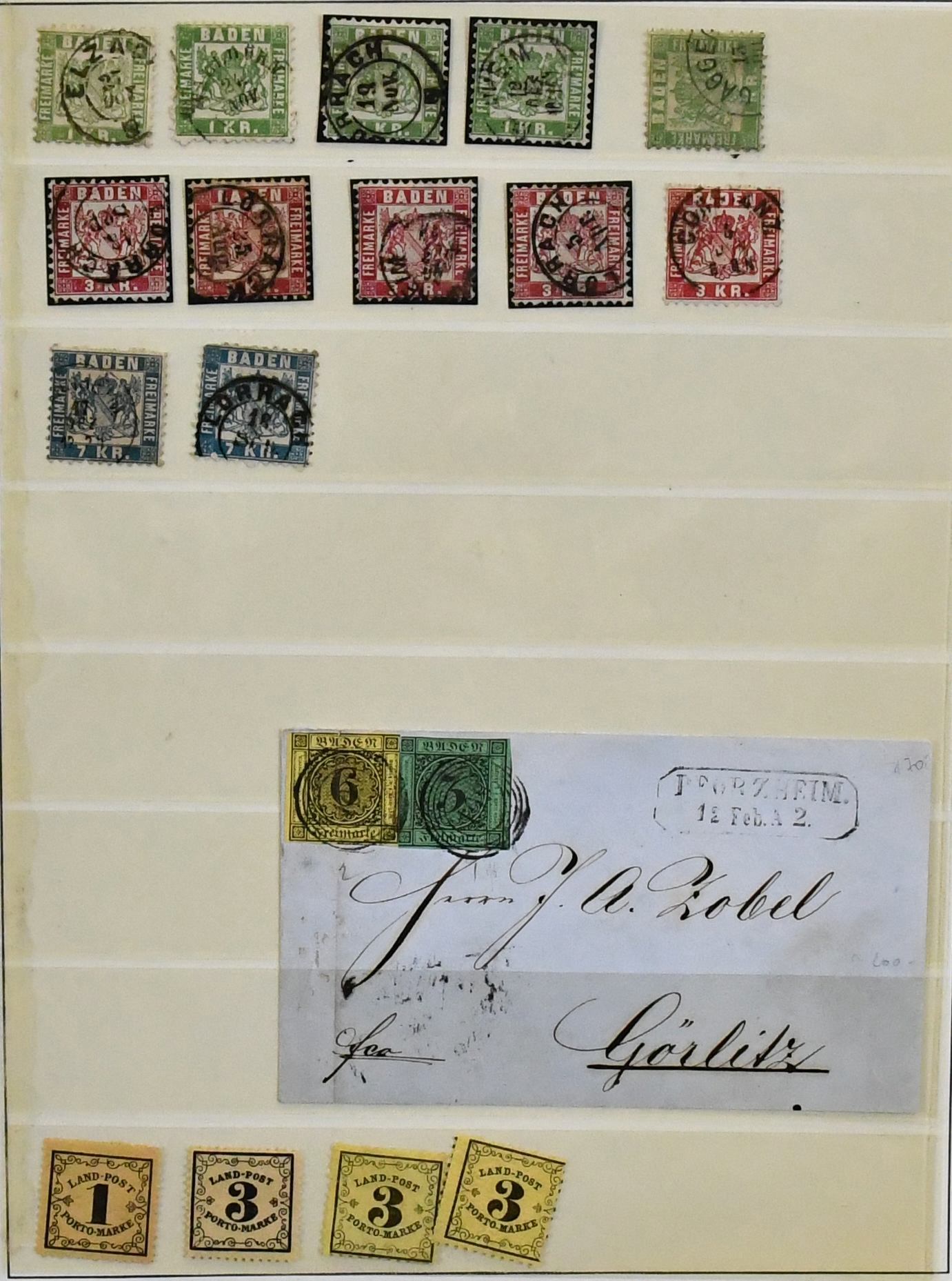 Baden, gestempelte Slg. in oft überdurchschnittlicher Erhaltung ab Nr. 2a/b, 3a/b, 4b-8, 9 im Dreierstreifen, 11a/b, 19a in MiF mit Nr. 23 auf Bfst., Paar 20a, sowie je Paare Nr. 25a und Landpost Nr. 1x. Mi. 2070,- plus eine unseres Erachtens falsch gestempelte Nr. 22 unberechnet