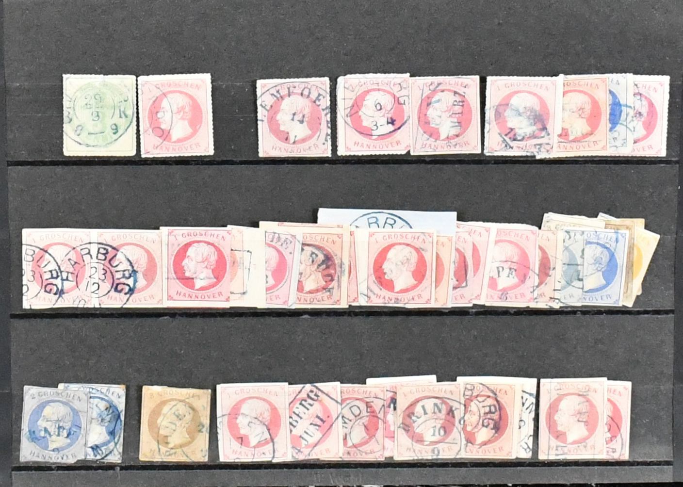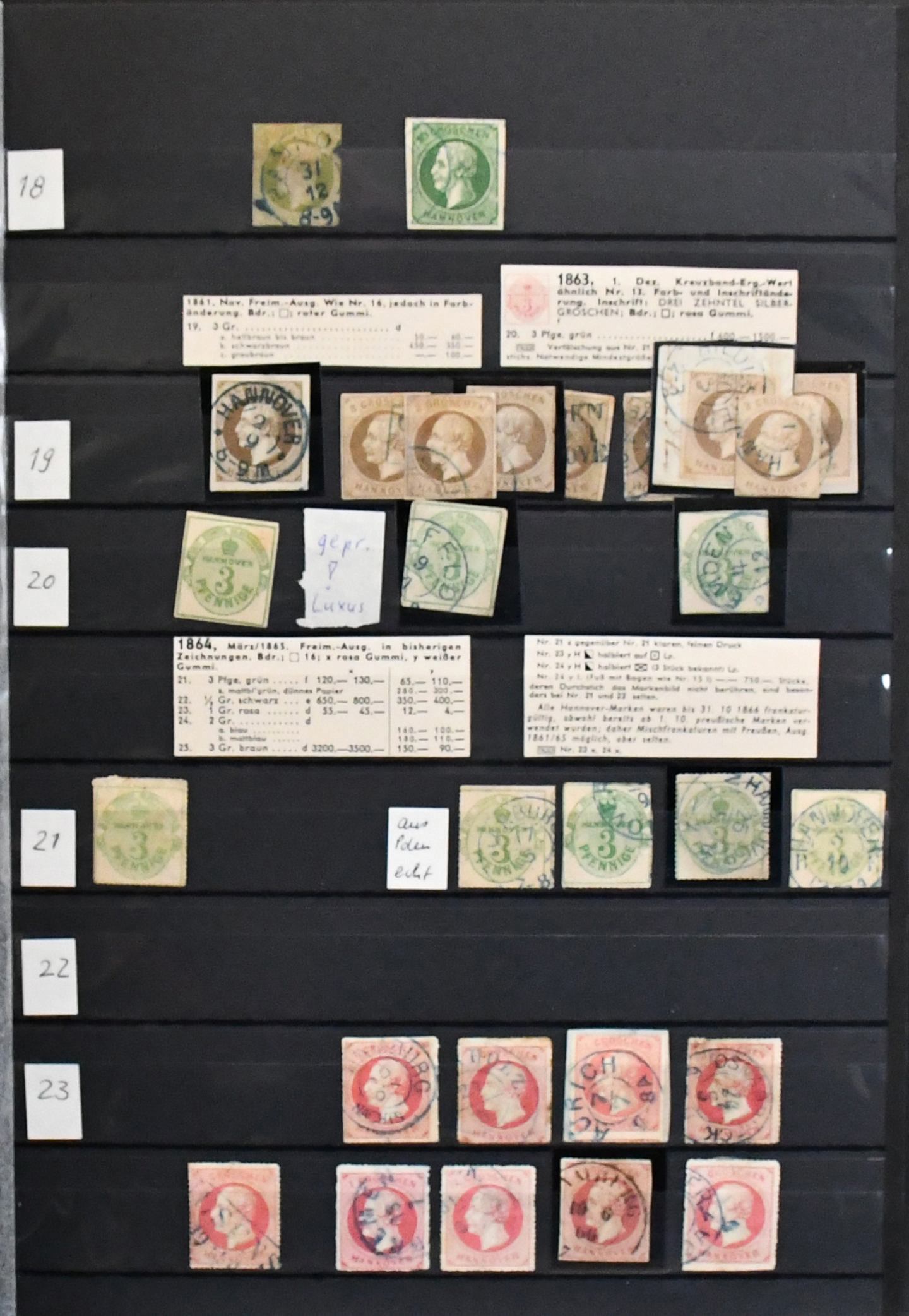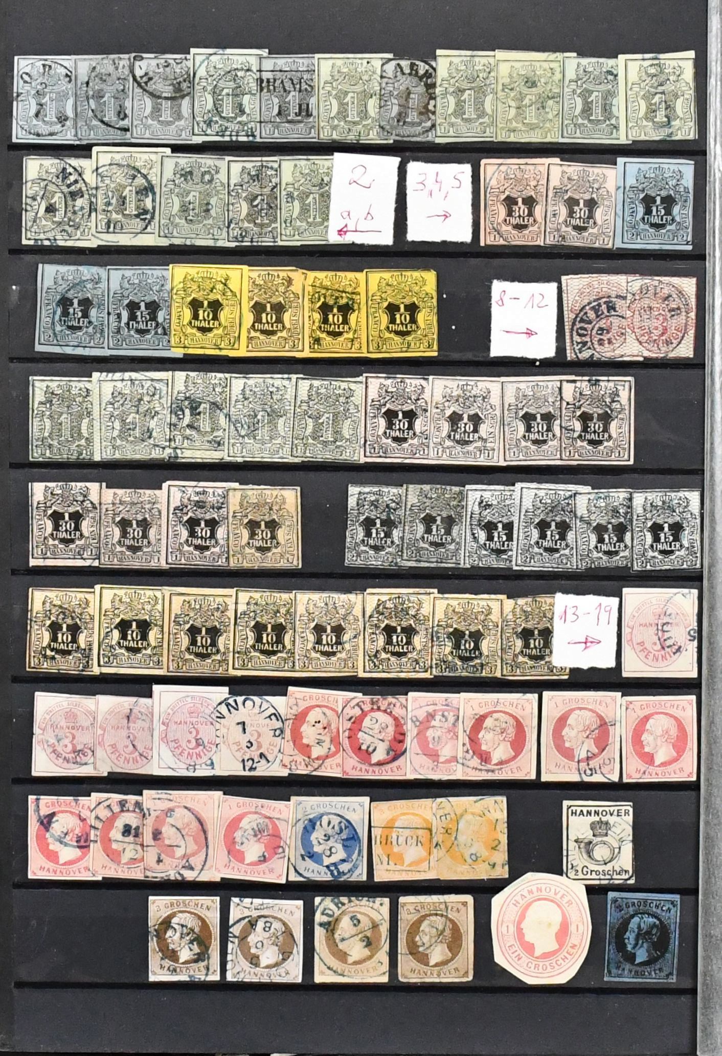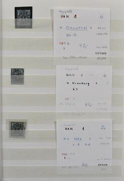 Hannover, weit überkomplette Slg. in üblich untersch. Erhaltung auf Vordrucken, mit Besonderheiten wie Paar Nr. 2b, immer fehlender Nr. 6, zweimal Nr. 18 (gest. und ungebr.), 20, ferner Nr. 17x einmal vom Rand gest. usw. Mi. 6800,- +