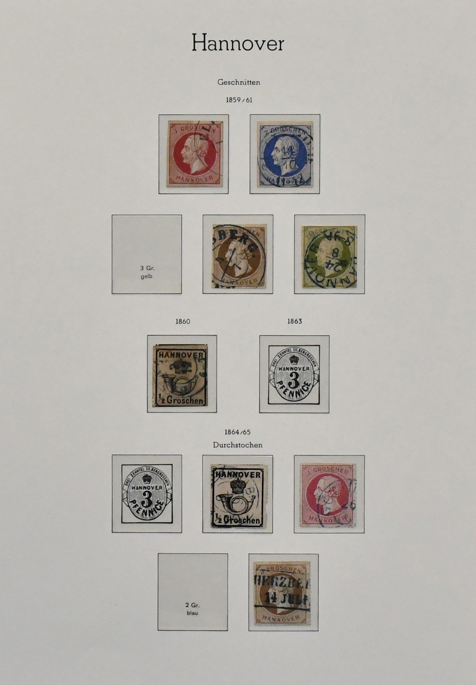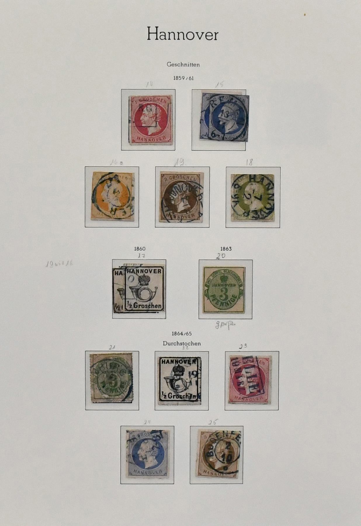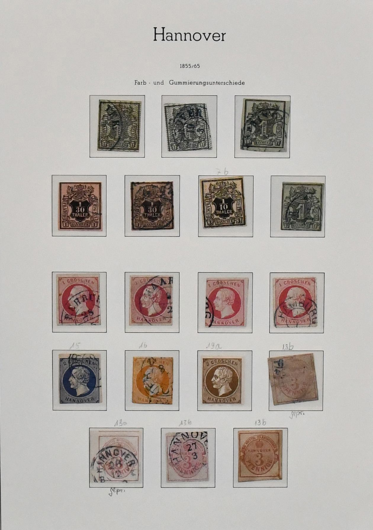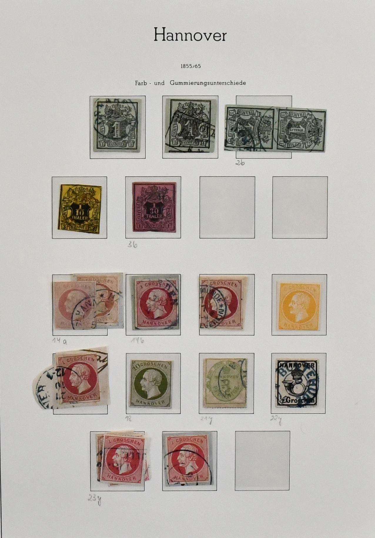 Hannover, bis auf Nr. 12 und 18 kpl. gestempelte Slg. auf Uralt-Vordrucken, dabei Nr. 3a/b, immer fehlende Nr. 6, 7a, 8a (Attest Berger "einwandfrei"), 8b, 16a/b, zentr. gest. Nr. 20, 22y etc. Mi. 4600,-