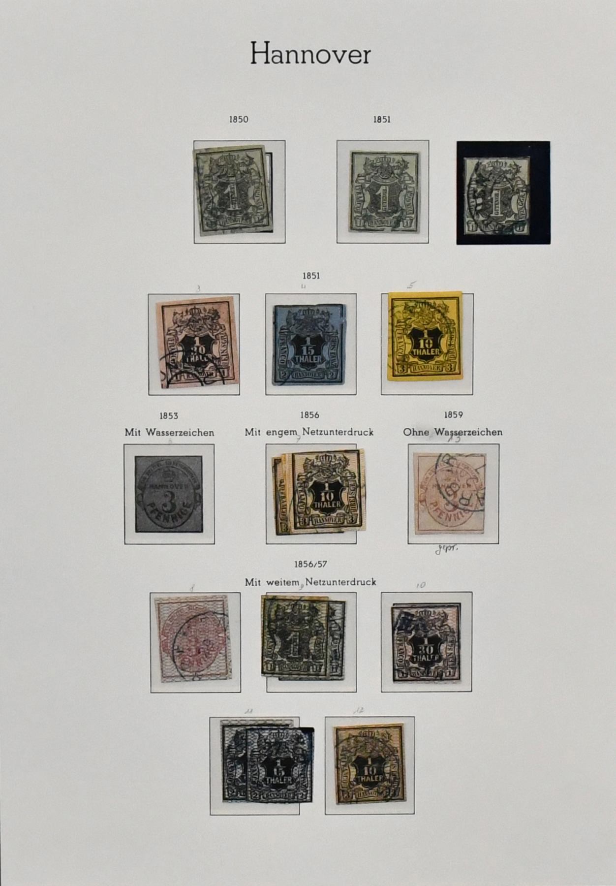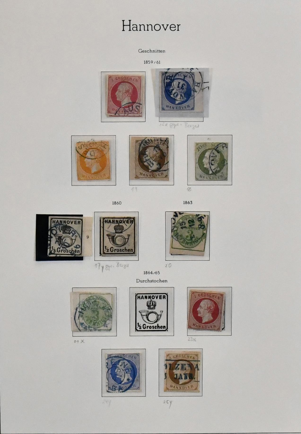 Hannover, gest. Sammlung auf Albumseiten, dabei u.a. Nr. 1 mit L1 "(Boden)teich", 2a und 3b je vom Bogenrand mit Reihenzähler, 7, seltene Nr. 18 gepr. Berger, 19, 25 usw., hoher KW