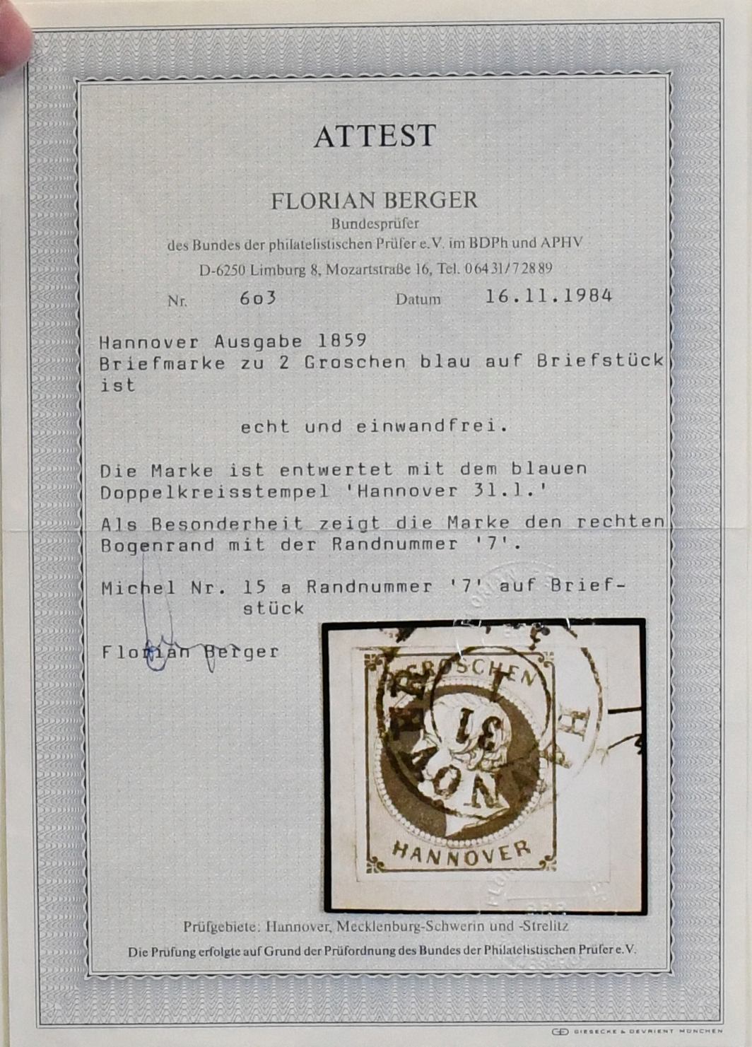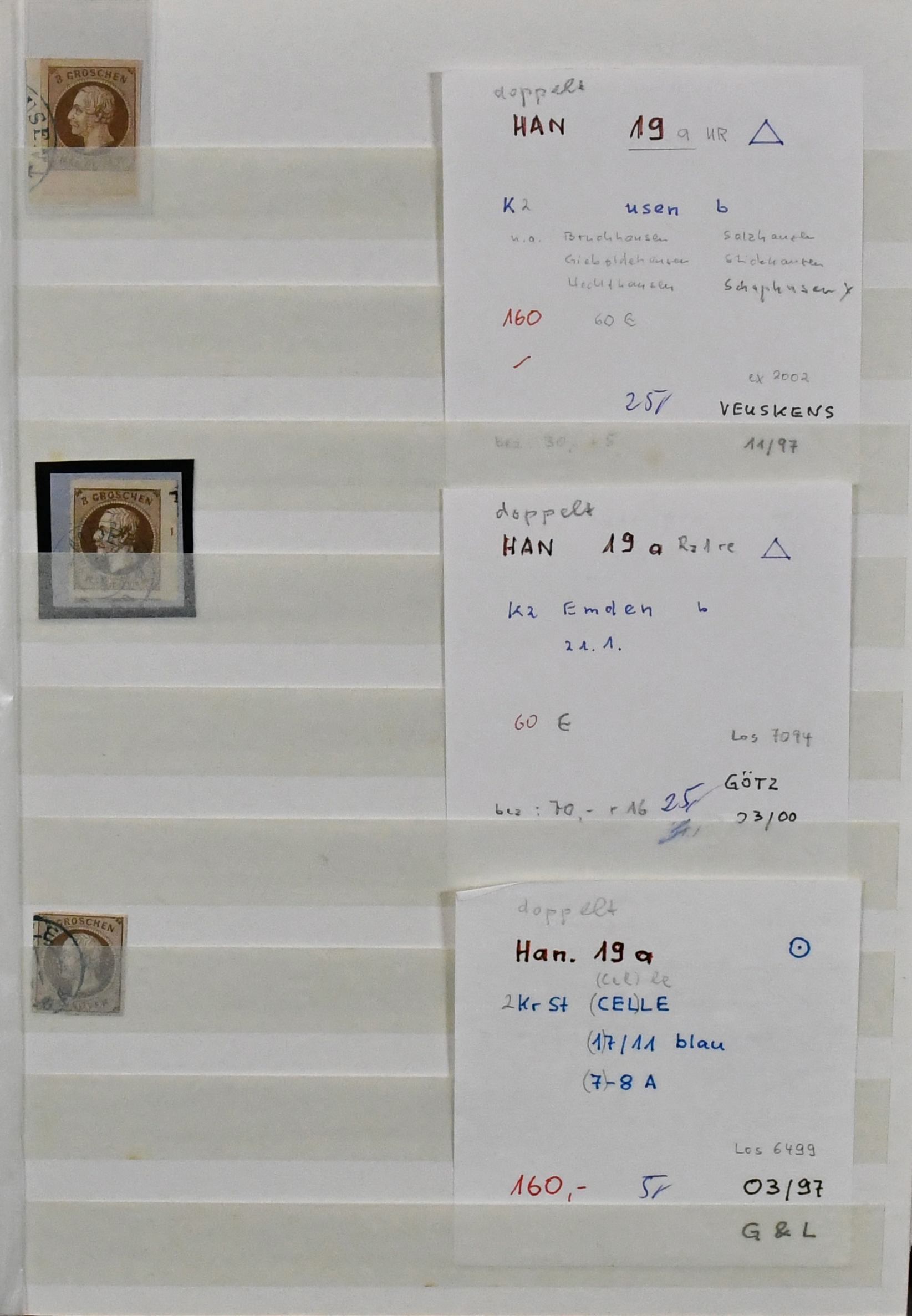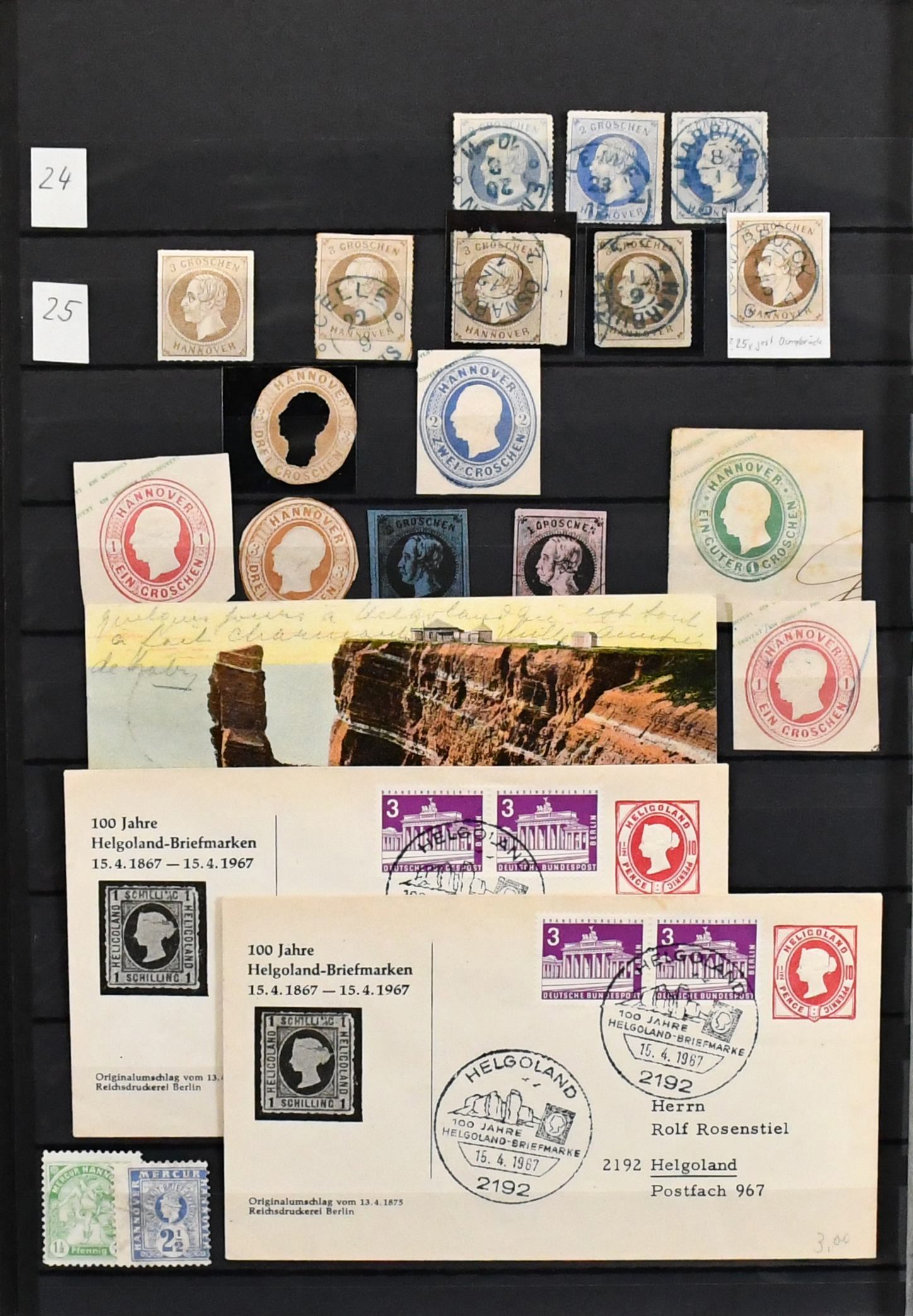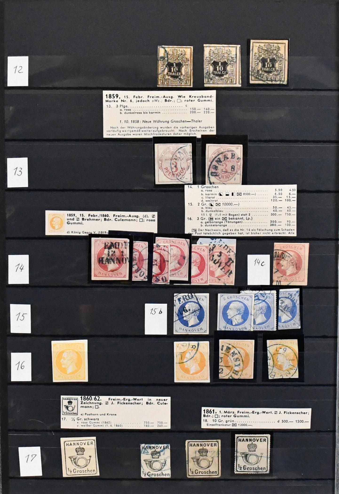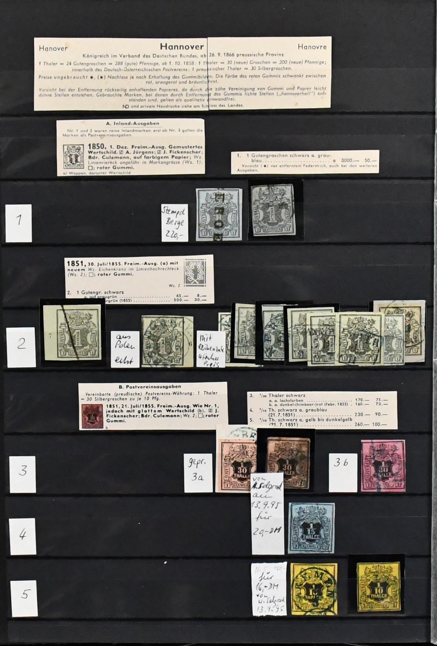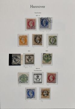 Hannover, ausschließlich gestempelte Slg., relativ komplett, fast alle einzeln auf Auktionen erworben (z.B. eine Nr. 22III für 200,- + Aufg.). Zu praktisch jedem Stück existiert eine genaue Beschreibung, auf welcher Auktion erworben etc., ab mehrf. Nr. 1, u.a. mit blauem K1, 4 (4 inkl. sehr seltenem und markantem Plattenfehler II), 5 (5 inkl. PF IV), 7a, 8a, 11(3), 12 (6 inkl. PF III), 13a, 14dII(2), 17 (2, einmal hs. "Rethem"), 19 u.a. Bogenecke re. oben auf Briefstück, 20 (gepr. Thier), 22III, bis Nr. 25(4). Nur nach Michel schon 6700,-, mit den seltenen Plattenfehlern und vielen einzeln gekauften Stücken ungewöhnlich!