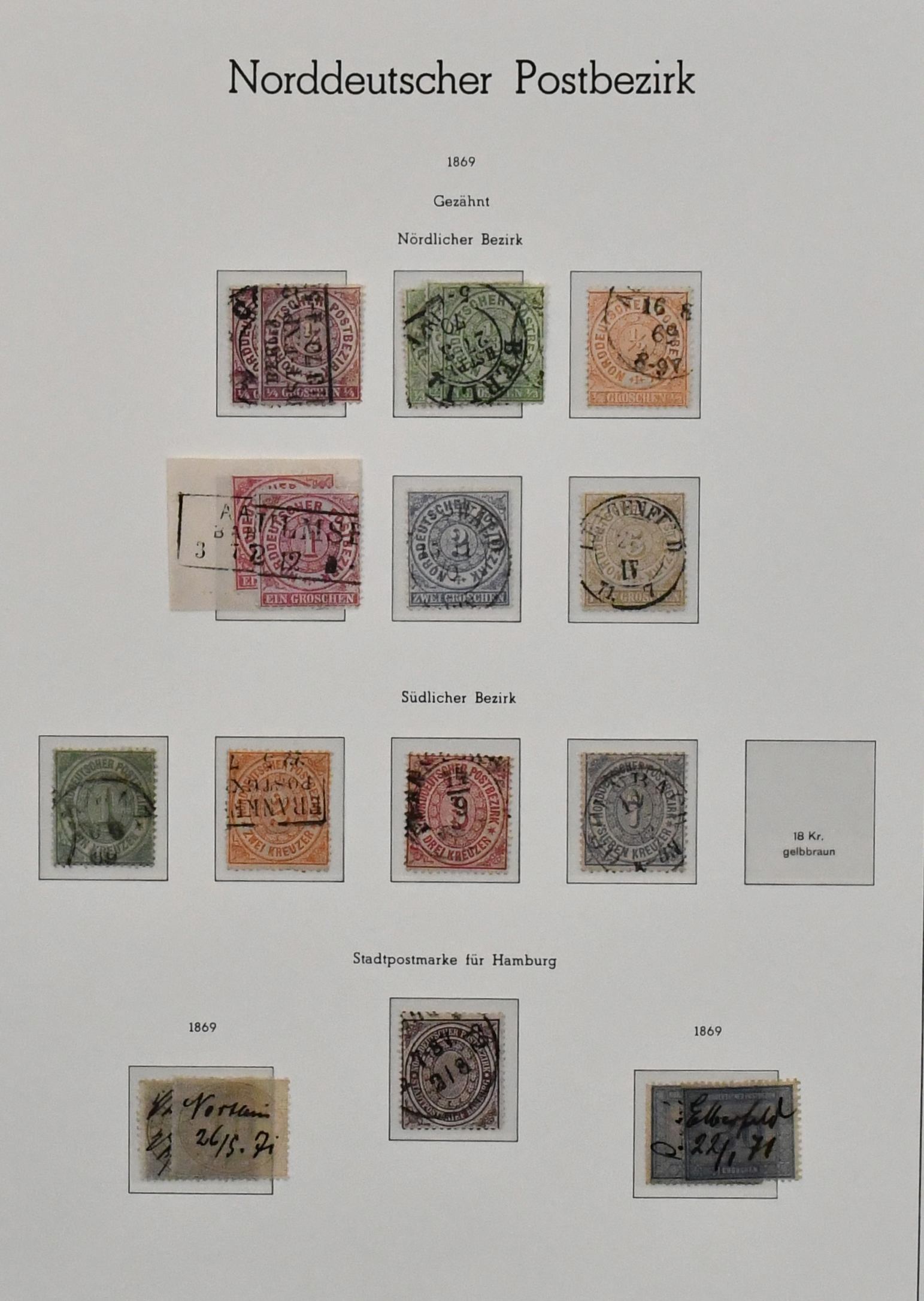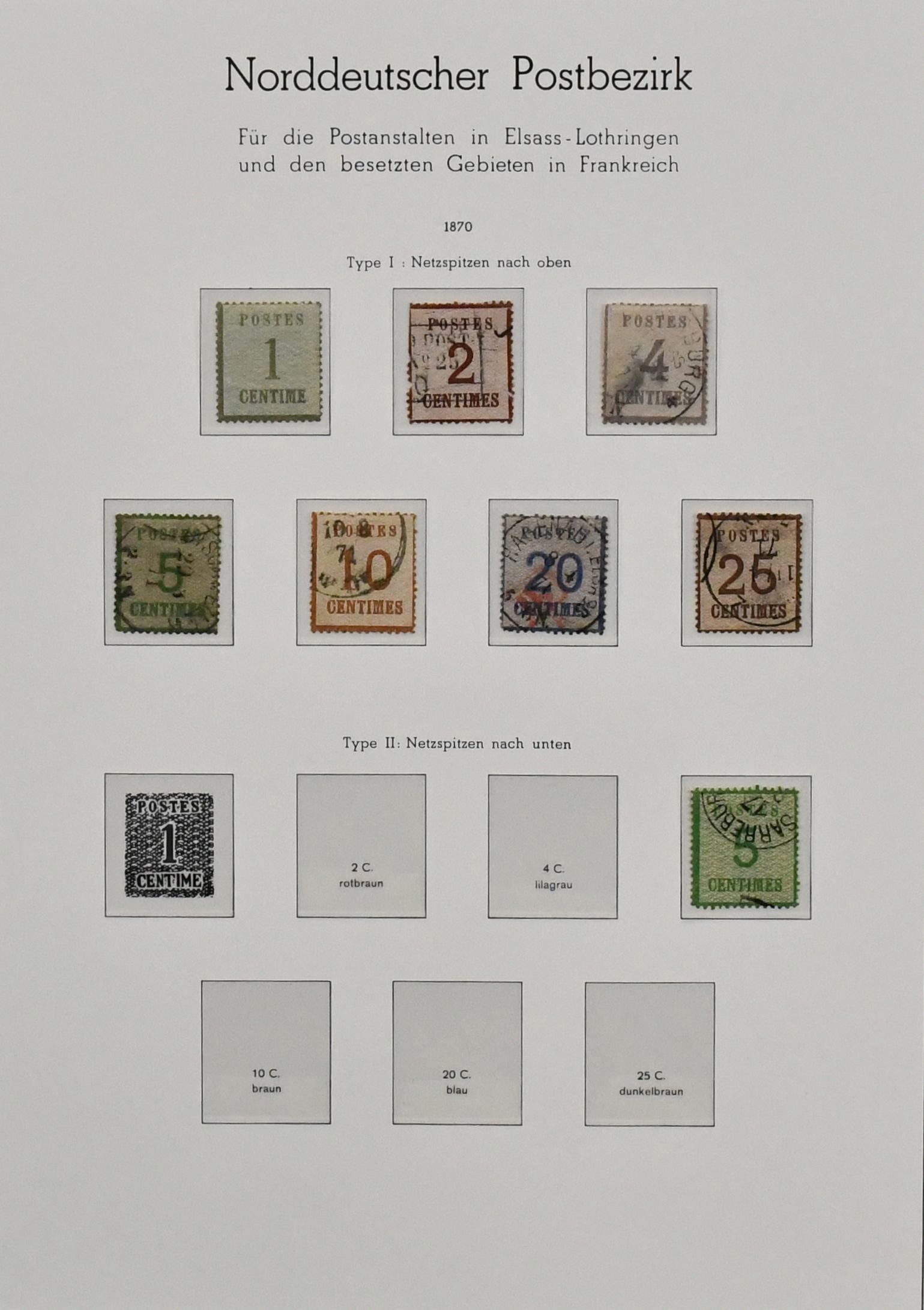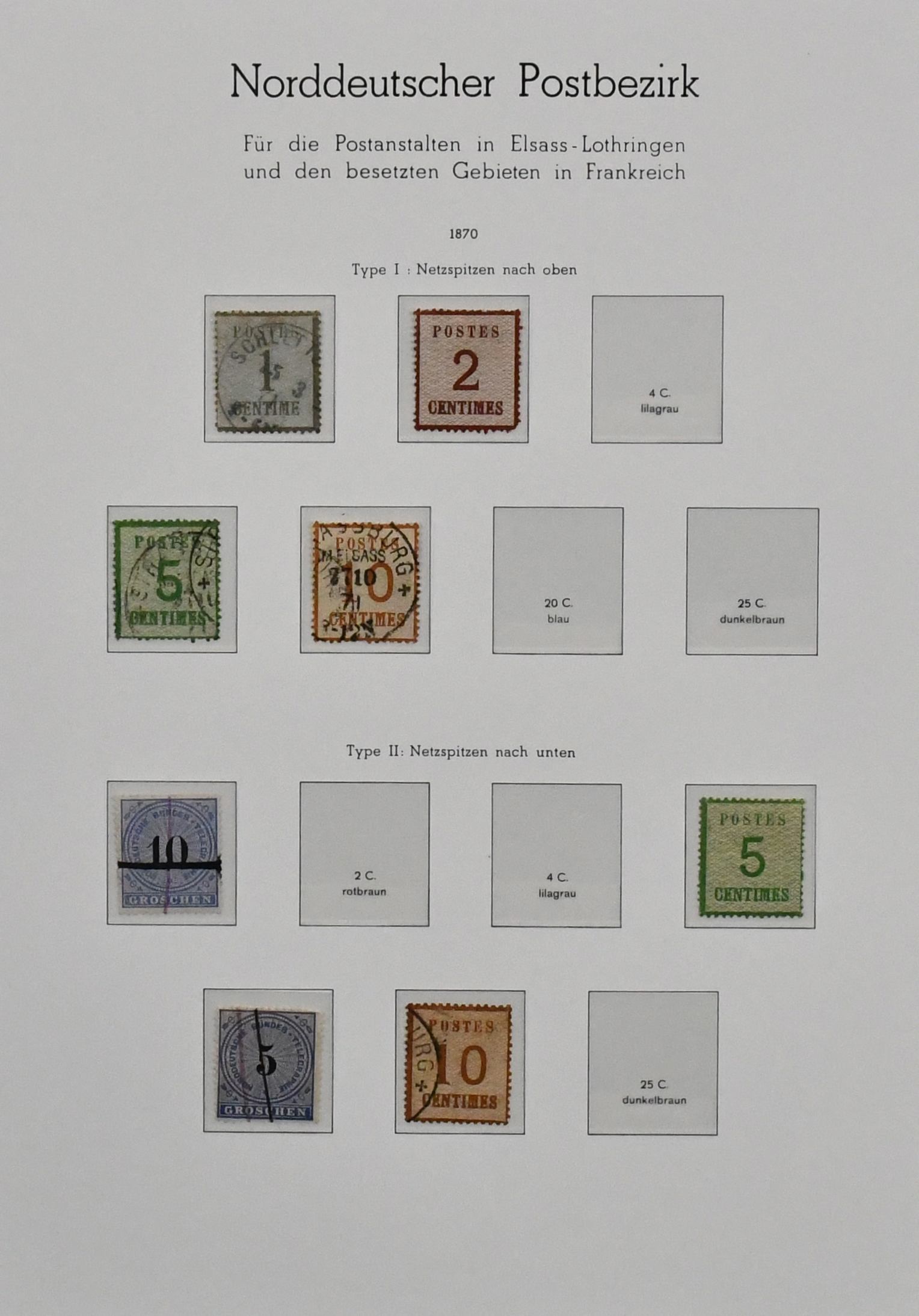 Norddeutscher Postbezirk sowie Elsaß-Lothringen, jeweils komplette Sammlungen auf KABE-Vordrucken (inkl. Dienst mit Kreuzer), dabei die seltene Nr. 23 (18 Kr.) sehr schön zentrisch gestempelt "Romrod"